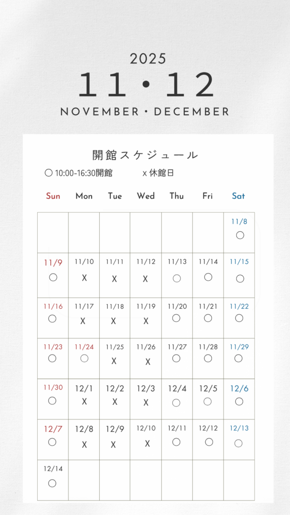2025/11/08お知らせ 本年度2025年(令和7年)最終開館日は12月14日(日)です。 < 前の記事へ 一覧に戻る 次の記事へ > カテゴリ お知らせ(142) メディア掲載情報(0) 最近の記事 2025/12/27お知らせ 《変更のお知らせ》2026年は3月13日(金)より開館 2025/12/16お知らせ 冬期休館・来シーズン開館予定のお知らせ 2025/12/05お知らせ ルネ・ラリックの作品が新たに加わりました。 アーカイブ 2025年12月 (3) 2025年11月 (6) 2025年10月 (4) 2025年9月 (1) 2025年8月 (3) 2025年7月 (9) 2025年6月 (1) 2025年5月 (3) 2025年4月 (17) 2025年2月 (1) 2025年1月 (3) 2024年12月 (6) 2024年11月 (6) 2024年10月 (3) 2024年9月 (8) 2024年8月 (4) 2024年7月 (6) 2024年6月 (1) 2024年5月 (2) 2024年4月 (4) 2024年3月 (4) 2024年2月 (1) 2023年12月 (1) 2023年4月 (1) 2023年3月 (1) 2022年12月 (2) 2022年9月 (3) 2022年8月 (3) 2022年7月 (3) 2022年6月 (1) 2022年5月 (1) 2022年4月 (1) 2022年3月 (2) 2021年11月 (1) 2021年10月 (1) 2021年9月 (1) 2021年7月 (1) 2021年6月 (1) 2021年5月 (1) 2021年3月 (3) 2020年11月 (1) 2020年10月 (1) 2020年7月 (1) 2020年5月 (3) 2020年4月 (2) 2020年3月 (6) 2019年12月 (1) 2019年10月 (1) 2019年8月 (1) 2019年4月 (1)